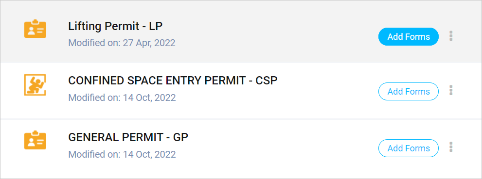 To modify permit forms, hover on a permit template featured in the list. As you hover, a Field Settings icon will appear. Click on the icon to navigate to the form settings panel.